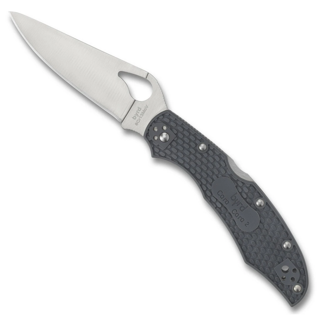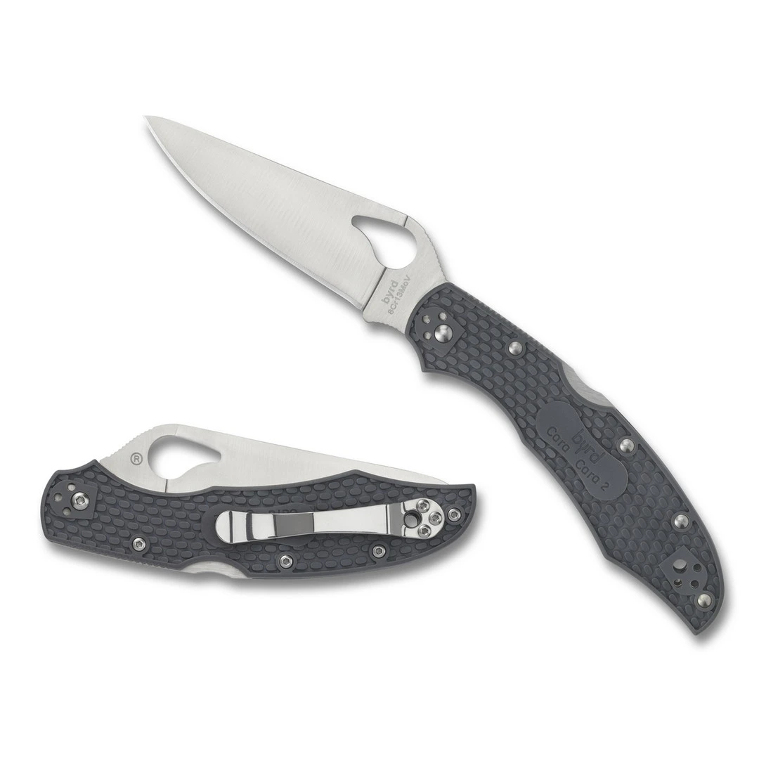 The second generation Cara Cara 2 has been a tried and true favorite of knife enthusiasts since its inception because of its maximum performance and reliability but now features screw-together construction which ensure precise alignment and operation. The Cara Cara 2 utilizes a lock back mechanism–a locking system positioned on the back of the handle that uses a rocker arm that pivots in the center while the blade is manually deployed with the help of Byrd’s signature comet-shaped hole. This knife is part of Spyderco’s Byrd family which offers all of the same functionality and convenience of Spyderco’s production models but at a lower price point for the budget-conscious or those especially new to knives. This lightweight model features grey FRN (Fiberglass-Reinforced Nylon) handle scales complete with Bi-Directional Textureâ„¢, a drop point style blade in a satin finish and the 4-way positional pocket clip allows for a tip up or tip down carry option on either side of the handle.