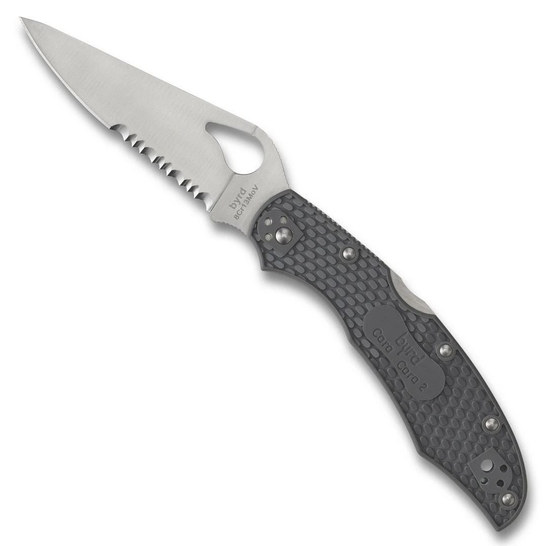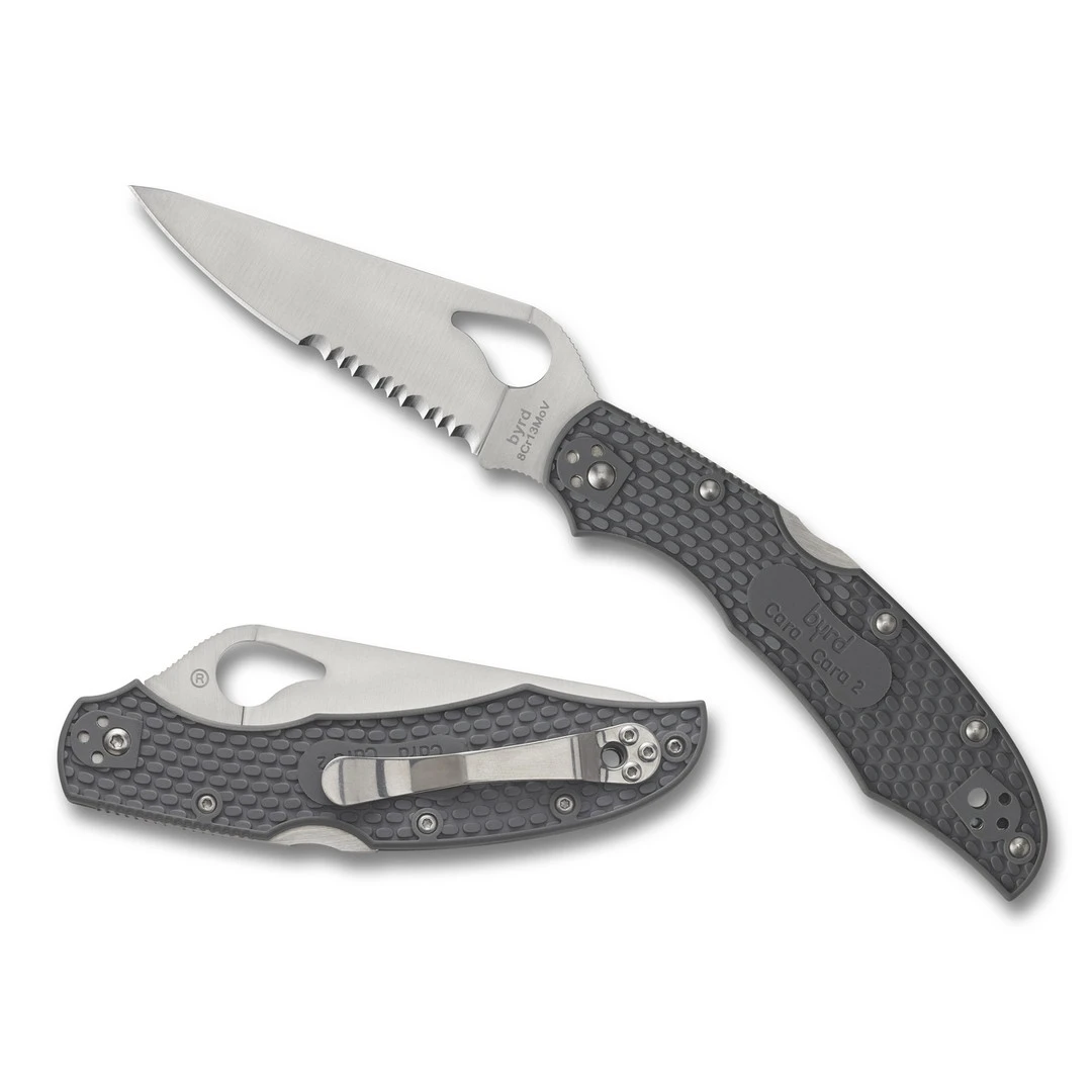 The second generation Cara Cara 2 has been a tried and true favorite of knife enthusiasts since its inception because of its maximum performance and reliability but now features screw-together construction which ensure precise alignment and operation. The Cara Cara 2 utilizes a lock back mechanism–a locking system positioned on the back of the handle that uses a rocker arm that pivots in the center while the blade is manually deployed with the help of Byrd’s signature comet-shaped hole. This knife is part of Spyderco’s Byrd family which offers all of the same functionality and convenience of Spyderco’s production models but at a lower price point for the budget-conscious or those especially new to knives. This lightweight model features grey FRN (Fiberglass-Reinforced Nylon) handle scales complete with Bi-Directional Textureâ„¢, a partially serrated drop point style blade in a satin finish and the 4-way positional pocket clip allows for a tip up or tip down carry option on either side of the handle.