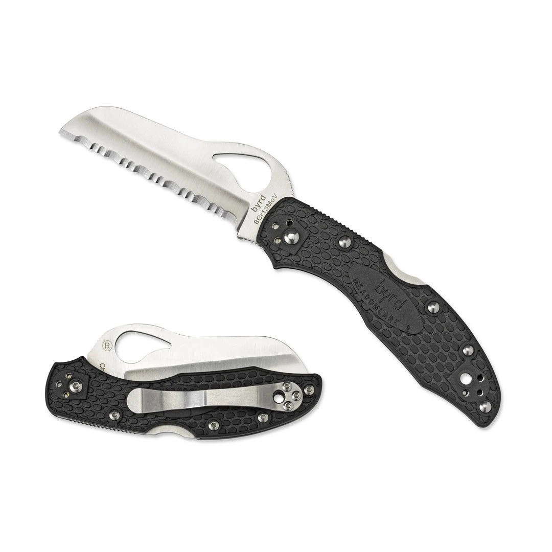 The newest installment of the Meadowlark 2 family is ideal for hunters or rescue personnel. This model features a flat ground stainless steel blade and that offers great cutting performance while still providing ease of maintenance and strategic placed jimping for secure grip. The Meadowlark 2 utilizes a lock back mechanism–a locking system positioned on the back of the handle that uses a rocker arm that pivots in the center while the blade is manually deployed with the help of Byrd’s signature comet-shaped hole. This knife is part of Spyderco’s Byrd family which offers all of the same functionality and convenience of Spyderco’s production models but at a lower price point for the budget-conscious or those especially new to knives. This lightweight model features black FRN (Fiberglass-Reinforced Nylon) handle scales complete with Bi-Directional Texture™, a fully serrated (SpyderEdge) sheepsfoot style blade in a satin finish and the 4-way positional pocket clip allows for a tip up or tip down carry option on either side of the handle.