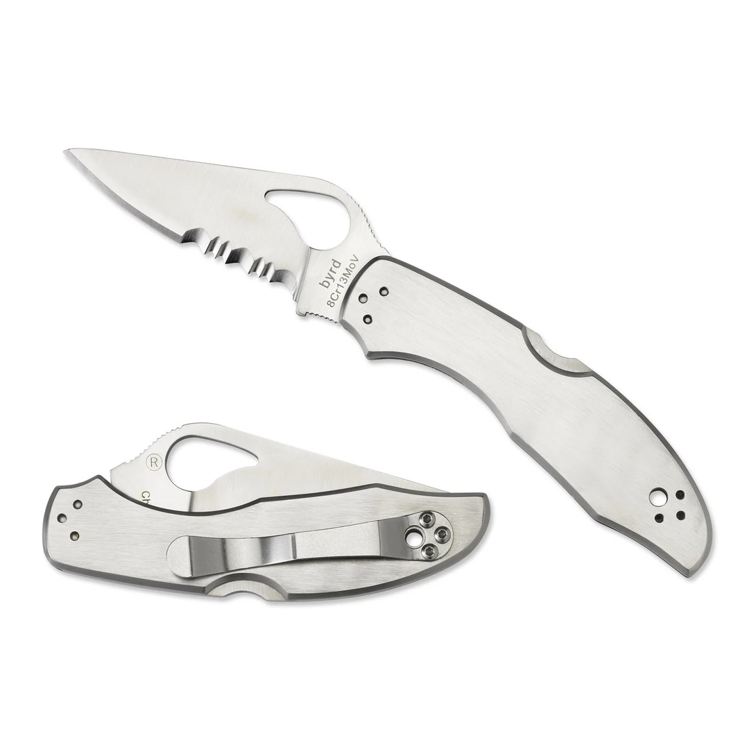 The Meadowlark 2 family is actually a dollar-conscious clone of the ever-so-popular Spyderco Delica folder with an array of handle options and edge configurations. This model features a flat ground stainless steel blade and that offers great cutting performance while still providing ease of maintenance and strategic placed jimping for secure grip. The Cara Cara 2 utilizes a lock back mechanism–a locking system positioned on the back of the handle that uses a rocker arm that pivots in the center while the blade is manually deployed with the help of Byrd’s signature comet-shaped hole. This knife is part of Spyderco’s Byrd family which offers all of the same functionality and convenience of Spyderco’s production models but at a lower price point for the budget-conscious or those especially new to knives. This heavier model features stainless steel handle scales in a silver finish, a partially serrated drop point style blade in a satin finish and the 4-way positional pocket clip allows for a tip up or tip down carry option on either side of the handle.