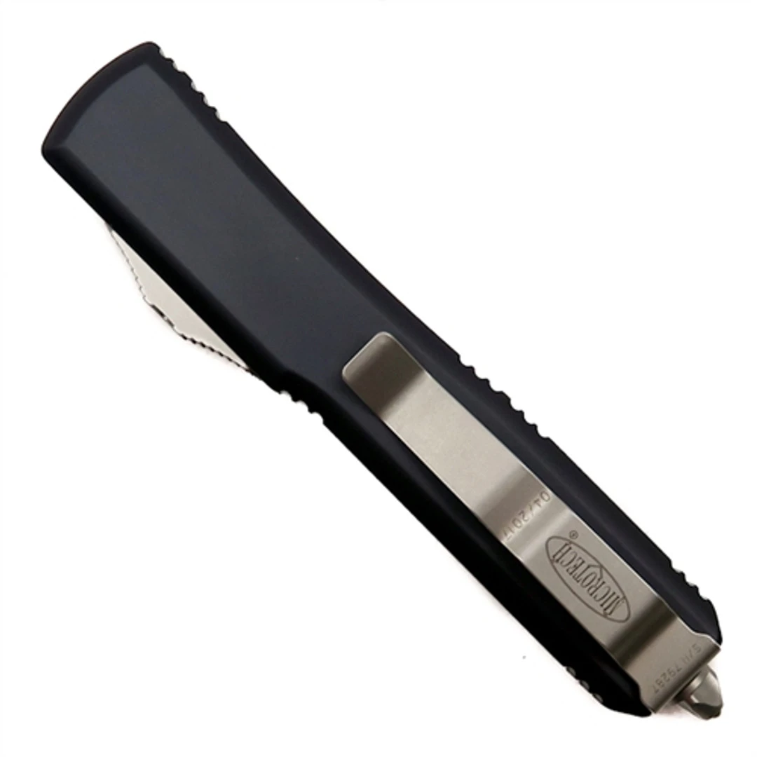 The Ultratech without question has been Microtech’s flagship out the front auto knife since its induction in 1999. Recently it has gone through an additional aesthetic redesign after the overwhelming success and praise of the traditional styling. While the dimensions of the Ultratech remain unchanged, the handle has been stripped back down to its original roots–now offering a smooth contoured chassis, however still boasting the tri-angle hardware, a redesigned thumb slide and the glass breaker that now includes a press fitted ball bearing for a more comfortable, but still functional, user experience. Each Microtech OTF knife has extremely sophisticated internal mechanisms which improve the overall operational functionality and reliability. This model features a contoured black handle complete with standard bead blasted hardware and an integrated glass breaker function along with a dagger style blade, that is fully serrated on one side and plain on the other, in a satin finish. Made in the USA.