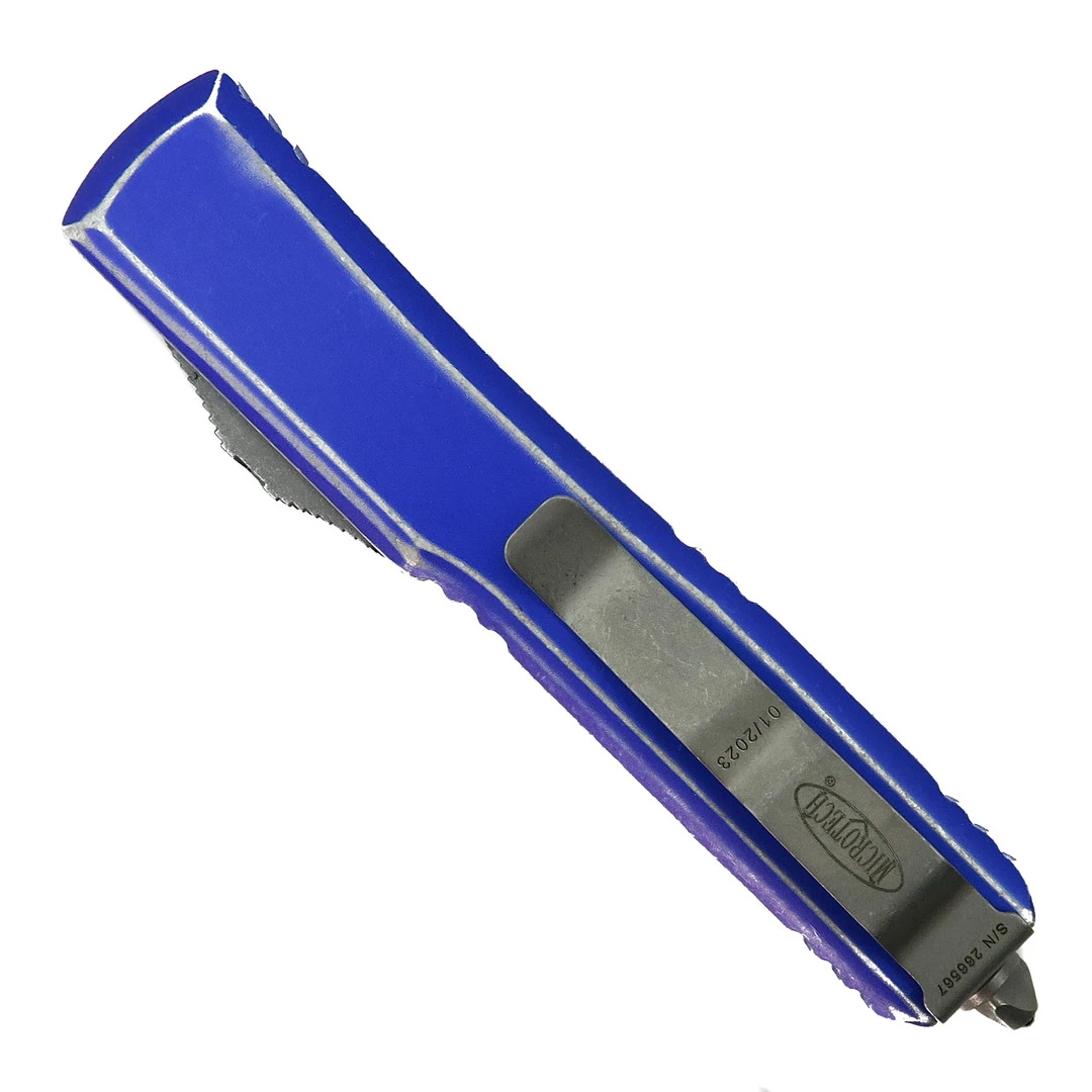 This Microtech Ultratech out-the-front knife features a distressed purple anodized aluminum handle and a tanto style blade in an apocalyptic stonewash finish.