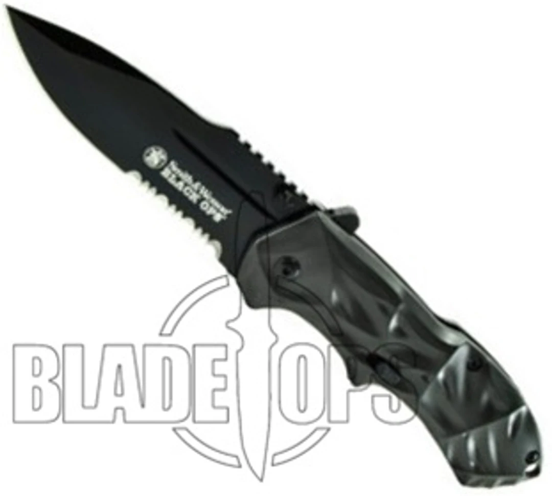 Smith & Wesson new assisted knife series, the third set of Black Ops Spring Assist Knives, are the best spring assist knives on the market in the sub $40 price range. The SWBLOP3 has a unique handle pattern. Made with an ergonomic composite, this lightweight spring assist knife has good action and nice, tight lock up. It can be opened with the ambidextrous thumb studs or with the spine trigger. The spine trigger is a new addition to the 3 series. The SWBLOP series has a slide safety about halfway down the handle. It comes with a removable pocket clip that allows the knife to ride fairly deep in your pocket. The blade on the SWBLOP3S is 4034 stainless steel, black teflon coated, and is partially serrated. This fantastic spring assist knife will quickly become your new favorite every day carry knife–all at an unbeatable price. Knife Category: Spring Assist Knife Blade Style: Drop Point Action: Spring Assist, Side Open Blade Length: 3 1/8″ Blade Thickness: 1/8″ Blade Material: 4034 Stainless Steel, Black Teflon Coat, Part Serrated Open Length: 7 3/4″ Closed Length: 4 1/4″ Weight: 4.4 Ounces Handle Thickness: 5/8″ Handle Width: 15/16″ Handle Material: Composite Clip: Tip Up, Removable Lock Mechanism: Liner Lock Safety: Slide Safety