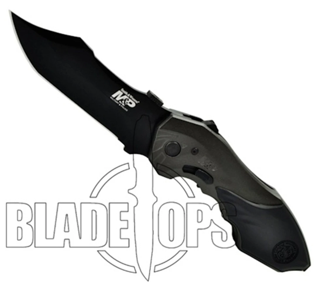 The brand new SWMP5 spring assisted knife series is big and extremely well built. This Smith & Wesson Military & Police series has an upgraded safety mechanism. The slide safety works like a charm. Made with an extremely ergonomic shape, this spring assisted knife is comfortable to hold. Comes with the MAGIC assisted openeing system, dual thumb stud opener and spine opener (which creates a nearly automatic feel to the knife), a glass breaker, and a tip down pocket clip. The SWMP5L has a grey and black handle and an all black, tactical plain edged blade. This version is by far the best yet of the bigger style SWMP MAGIC knives. Blade Length: 3.25″ Overall Length: 8 3/8″ Handle Length: 4 7/8″ Steel: 4034 Stainless Steel Blade Style: Clip Point Blade Handle Material: Grey Aluminum with Rubber Outlay Locking Mechanism: Linerlock Side Safety and Glass Breaker Made in Taiwan Weight: 7.2 Ounces