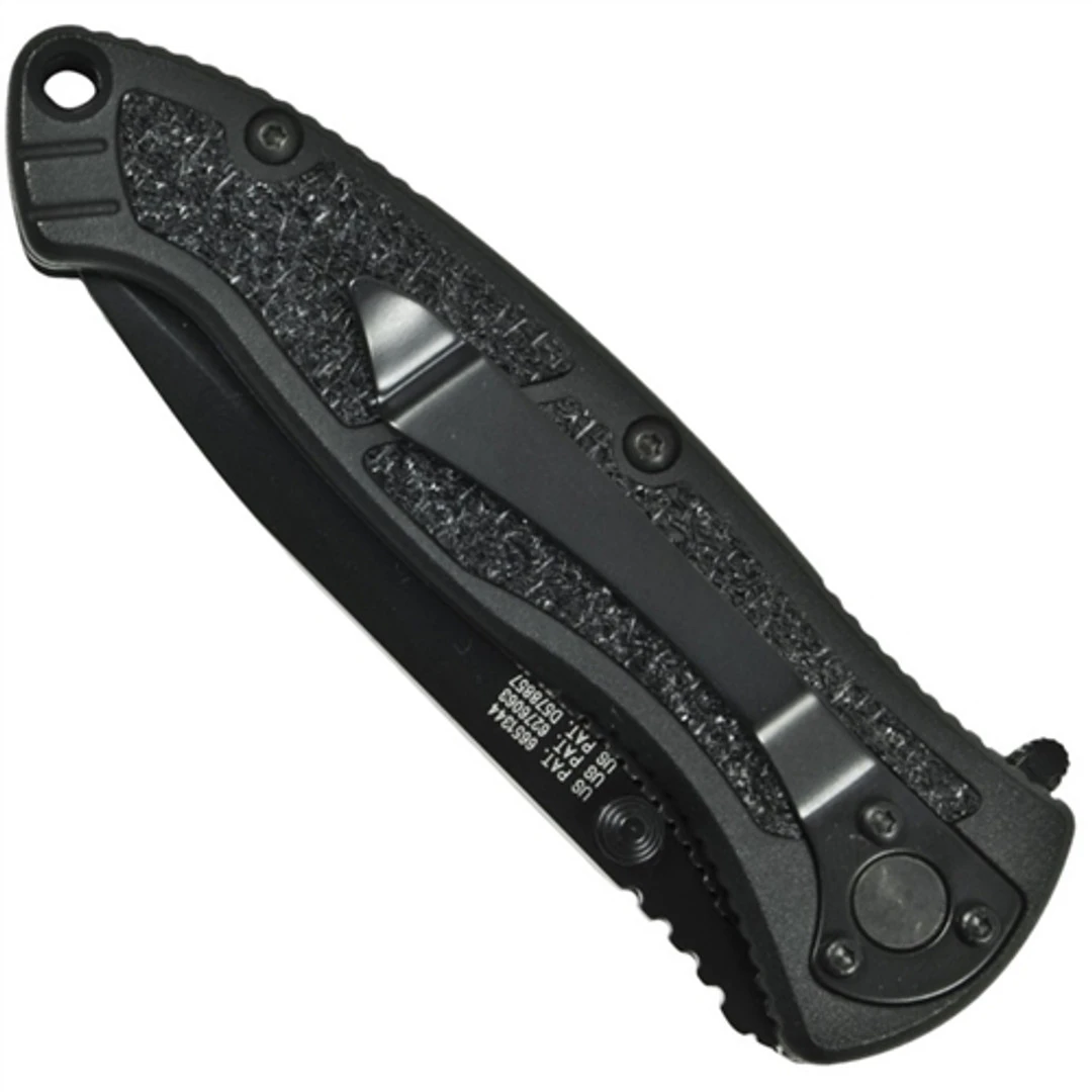 The Smith & Wesson SWATMB Spring Assist knife snaps out amazingly fast and locks up tight with a linerlock. Using the M.A.G.I.C. (Multipurpose Assisted Generation Innovative Cutlery) system, this knife opens as fast as an auto knife. The SWATMB features a Drop point plain edge blade with a black finish and a black T6061 aluminum handle with grip inserts. The SWATMB is an amazing knife that is perfect for daily carry. The blade opens using either the thumb stud or you can press the spine trigger and snap the blade right out. The safety is built right on the side of the handle for easy access. The handle also sports a lanyard hole. Comes with a pocket clip. The SWAT series features three size knives, this model is the medium size knife. SPECIFICATIONS: Blade Type : Drop Point Blade Length : 3.15 in Overall Length : 7.45 in Closed Length: 4.20 in Steel :4034 Stainless Steel, Black Finish Handle Material : Aluminum, Black Weight : 3.5 oz Edge Type : Plain
